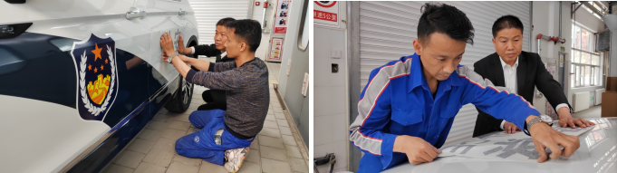 5為:售后漆工冶龍正在為警車貼警徽標(biāo)志,他說:“警車是公務(wù)用車,每次粘警飾我都感到很神圣,干活兒特別用心細(xì)致,一定要把車身警飾做得非常好才行。警徽閃耀,守望千家萬戶。我是漆工也是工匠,必須精益求精,把活兒干漂亮,這也是汽貿(mào)漆工的臉面。每次我都把車清洗干凈,用卷尺量好間距,用記號(hào)筆畫好。在貼的過程中用刮板反復(fù)擠壓空氣,這樣才能使警徽粘得更牢固更美觀。我要把公司倡導(dǎo)的勞動(dòng)精神、工匠精神,通過不斷地學(xué)習(xí)鍛煉,提高本領(lǐng),把精湛的工匠手藝和貼心的服務(wù)傳遞給社會(huì)。