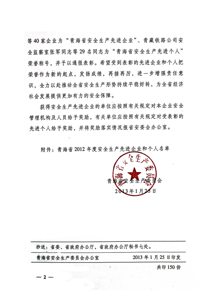 2012年,在省委、省政府的正確領(lǐng)導下,青海省物產(chǎn)集團總公司認真學習貫徹黨的十八大精神,全面貫徹落實科學發(fā)展觀,牢固樹立以人為本、安全發(fā)展的理念,深入開展"安全生產(chǎn)年"、"隱患排查治理"、"打非治違"等活動,為促進全省安全生產(chǎn)形勢持續(xù)穩(wěn)定好轉(zhuǎn)做出了積極貢獻。為此,經(jīng)省政府同意,省安全生產(chǎn)委員會決定授予青海省物產(chǎn)集團總公司"2012年度安全生產(chǎn)先進企業(yè)"榮譽稱號。